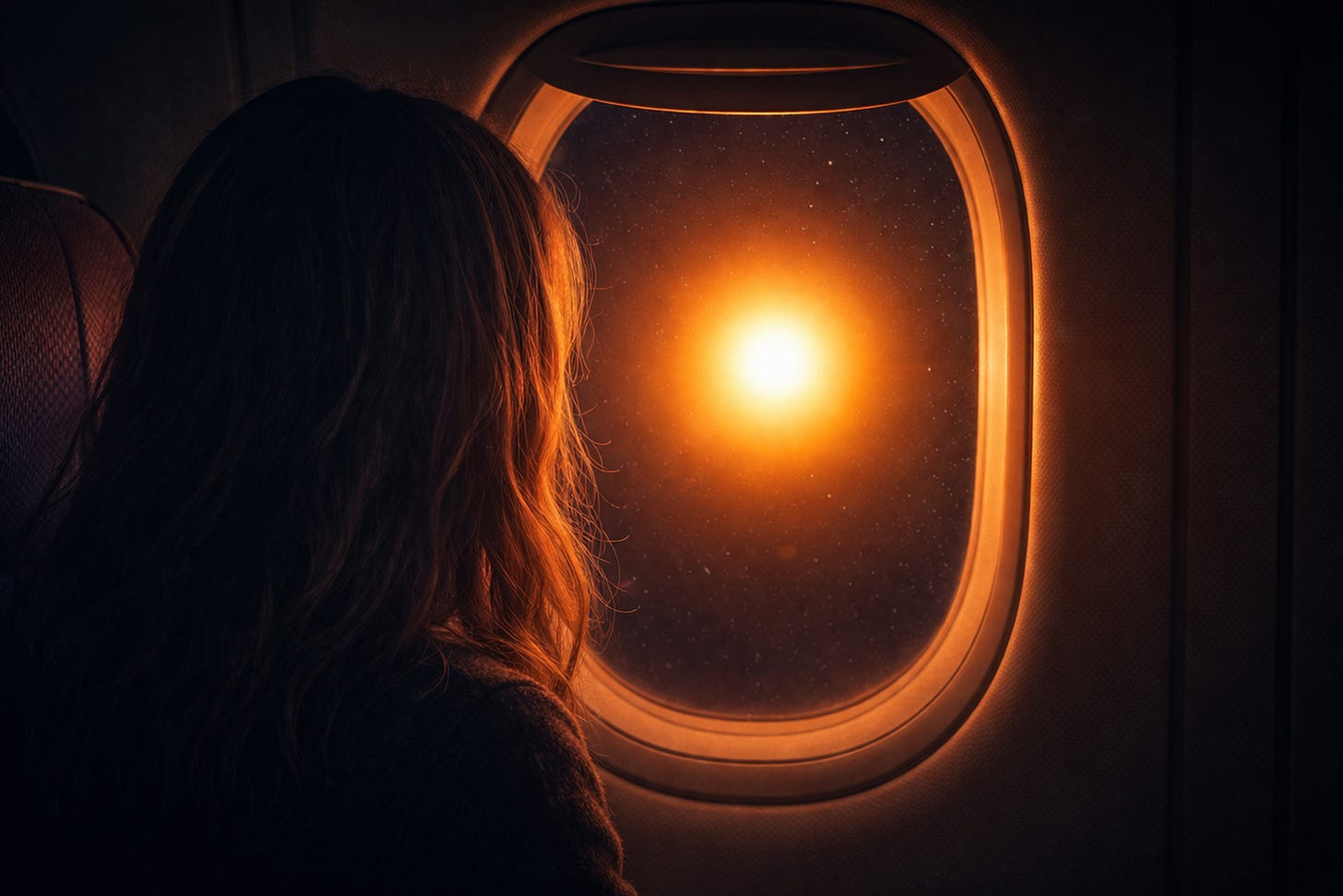 It occurred to her that they weren’t lightning bolts but the orbs, no longer floating but moving at unimaginable speeds, high to low back to high, crossing the wing edges, and doing it over and over. It’s them, she said to James, breathless. They’re circling us. They’re circling the plane. Every three seconds became every two seconds and then every second, as they seemed to speed up, creating an orange strobe effect. With each pulse they could see other passengers’ faces gripped by fear, awe, or both. Some people cried thinking there was something wrong with the plane and that they wouldn’t make it. The captain never said anything over the speakers to soothe nerves, but probably because the speaker system had gone out with the interior lights. The flight attendants hurried up and down the aisles, trying to calm people down without success.